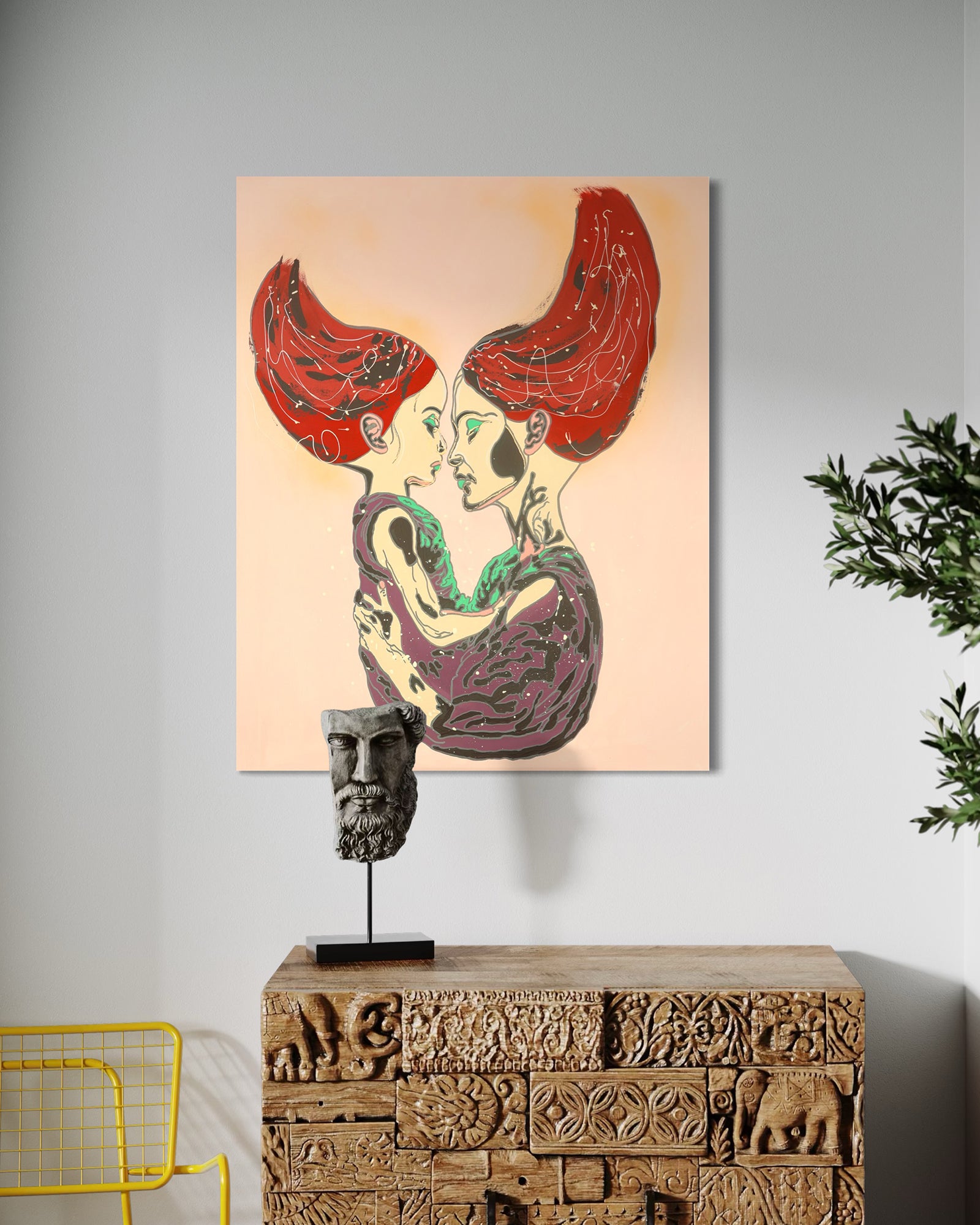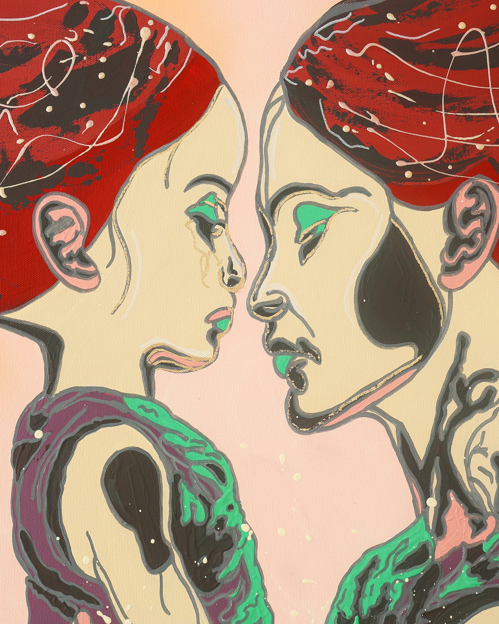 Ember zeigt die Beziehung zwischen Mutter und Kind als Moment stiller Nähe. Zwei Figuren stehen sich gegenüber, verbunden und doch eigenständig. Warme und kühle Farben treffen aufeinander und machen Spannung, Verletzlichkeit und Zusammenhalt sichtbar. Das Werk erzählt von Bindung, die nicht perfekt ist, sondern ehrlich.